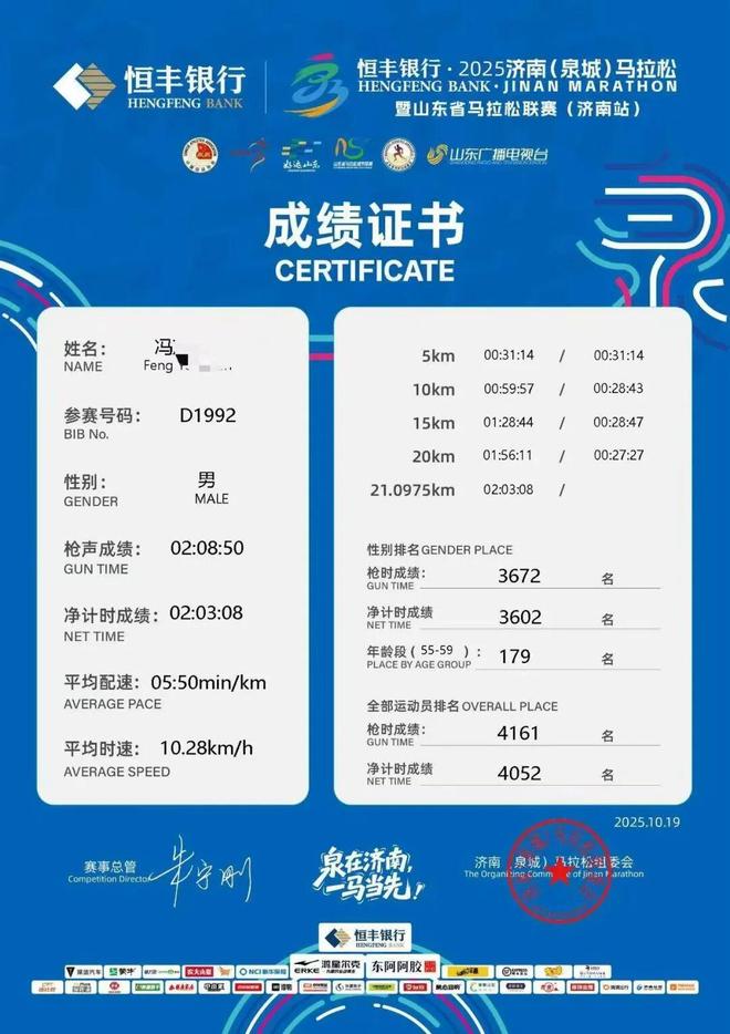 10月19日我完成了济南半程马拉松,这场比赛对我来说有着特殊的意义。我在这座城市出生,并在这座城市度过了小学、初中、高中的时光。我1985年高中毕业后出国留学,大学毕业后头几年在这个城市工作。我可以说我是一个“老济南人”。今年是我高中毕业 40 周年,我刚刚参加了 9 月份的高中 40 周年纪念聚会。在聚会上,我提到我要回家乡参加十月份的济南半程马拉松,但我的同学们似乎印象深刻,也持怀疑态度。我大概没想到40年后我还能回到家乡,完成半程马拉松,纪念我的青春。早上6点45分,我们到达了出发地。济南马拉松的入口有点拥挤,感觉交通效率不高。安检、入境、行李运送、等等。他们有点拥挤。完成入境流程并进入出口等候区花了30多分钟。起点有点拥挤,但我尽力完成了在训练营学到的热身动作。我独自静静地、庄严地取暖。再加上我比较职业的着装,人们可能会误认为我是“老兵”。事实上,我是一个刚刚参加过第二次半程马拉松的“新手”。 7点45分鸣枪后,用了4到5分钟才穿过起点。经过起点后,我启动秒表并打开预设节拍器(186步)来保持节奏。前两公里我按照教练的比赛策略,一点一点地加快步伐,让自己感觉舒服,但我不知道是因为回家的兴奋,还是因为我在出发前就用了赛斯。起步后我感觉很好(赛后分析是由于情绪)。1 公里后,我的心率升至 2 区,配速排在第三位。公里成绩为6分47秒,但仍处于规划阶段。我用了6分18秒跑完了第二公里,感觉很好,感觉很棒。大约两公里后,或许是迫于比赛气氛,他的速度逐渐加快。我的配速在4公里后约为5分52秒,在7公里后约为5分45秒。 9公里后,我的时间约为5分35秒。大约走了六七公里后,我遇到了一个之前没有预料到的问题。济南之旅很特别,终点比起点高100多米。我对爬坡的难度有心理准备,但没想到中间有这么多的起伏,还有这么多的起伏和缓坡。在完成第一次爬升和下降7、8公里后,我感觉自己失去了对自己的控制定速巡航策略。对于像我这样患有慢性膝盖损伤的人来说,下坡跑是非常不利的。此外,今天的配速超过了训练时的最大配速。我立即决定调整我的比赛策略。换句话说,我决定专注于我身体的感觉和我的心率,然后忘记它。记住你的节奏。步行上山可以充分提高心率。超出区域 2 并达到区域 3 是可以接受的(即使您的心率在接近攀爬顶部时达到区域 4)。上坡时要注意不要减速太多。当成本较低时,缩短步幅,有意识地加快步伐,放慢急促的呼吸,调节心率。上坡时有意识地加快步伐。下坡时,有意识地降低速度,以免配速波动太大。最重要的是要时刻牢记重要的骑行姿势,无论是上坡、下坡还是平坦的路面,保持核心稳定性并防止框架倒塌。上坡或下坡时不要用后腿踩或推。当您感觉到大腿抬起、前倾以及前腿因重力而自然下落时,请始终保持步频与步频装置的步速一致(保持步频为 186 或更高)。跑步时,我密切关注自己的姿势、步频、心率和身体感觉。我不再关注步伐,不再关注距离,也不再停下来欣赏沿途的风景。我在爬上坡时观察自己的心率,并在下坡时放慢速度,以适当调节我的心率和呼吸。这对我疲惫的心肺来说,算是一个小小的奖励。这可能是因为我一直很小心地保持最重要的驾驶姿势。除了爬坡时心率加快导致有点呼吸困难外,我并没有感到腿部肌肉有任何额外的疲劳。你的跑步态度吸引着我。我不知道是节奏吸引了我,还是节奏吸引了我。也许是他的灰白头发引起了注意,但大约走了七八公里后,一个年轻人跑到了我的身边。由于他才40岁出头,我鼓励他说:“继续努力吧。” 10公里后我感觉自己总是超过别人。从我身后经过的人很少。直到18公里后我才感觉到别人开始超过我了。济南线路最难的部分是17公里和18公里,这是近2公里的长爬坡,非常考验你的体力和意志力。然后我们回到原来的路线,继续下坡近2公里。由于我的膝盖有旧伤,所以在这个下坡期我只能慢慢跑(我感觉这段时间很多人超过了我)。 20公里后,又是一段近1公里的爬坡,接近终点时有一条约200 m的平缓小道。最后一公里如果赛道是上坡的。不知道是我体力不够,还是感觉今天的节奏比我预想的要快。我没有勇气跑这一公里。软道的最后1米到200米,我提前查看了手表,希望自己能在2小时3分钟内跑完(事实上,我启动手表,过了起点时大约落后了10秒,所以时钟结果比我的实际时间快)。我以稳健的步伐冲过终点线,摆出一个漂亮的姿势享受剩下的100米,冲过终点时我努力不笑,脸上露出轻松愉快的表情。当我冲过终点线的那一刻,我的脑海里浮现出一句非常粗俗的口号。 “我已经离开40年了,当我回来时,我仍然是一个年轻人。”回顾我的跑步历程:今年7月下旬我开始参加跑步学院的夏季线下训练营。浪琴教练将我分为零基础组我的实际身体状况。开营已经快一个月了,我最初的身体状况不好,所以教练开始给我制定一个起点比较低、循序渐进的训练计划,还是很科学、反应灵敏的。这段时间我感觉不错,决定加大训练强度,但结果膝盖受伤了。它回来了,我停止了三周的训练。现在看来,一切都要科学训练,按照教练的指示和计划进行。超速行驶会影响训练效果并可能造成伤害。由于年龄较大,体力下降,跑步基础知识一直薄弱(2025年初第一次参加训练营,当时没有基础跑步知识)。跑步姿势方面,轻步、后腿推